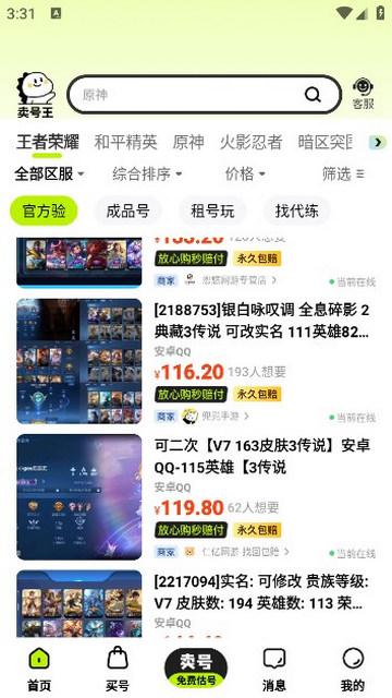 卖号王是一款专业的游戏账号交易平台,有着专业的账号鉴定师为玩家估价,账号价格透明,让玩家卖号不会吃亏。同时,玩家还能在上面买号,多种精品账号等待玩家挑选,平台还为玩家提供了多种找回包赔服务,为玩家的账号交易提供了保障。感兴趣的小伙伴快来本站下载体验吧。