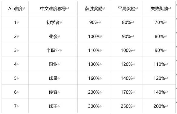 3、玩家选择不同难度下比赛获取的比赛奖励不同,假定AI难度3平局的奖励为基础,设为100%,则各个难度胜平负的奖励如下: