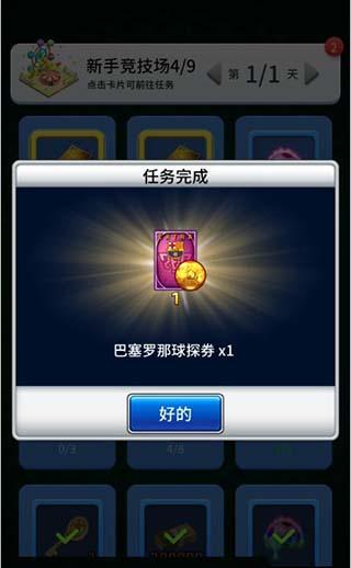 2、进去后,无脑踢荣誉赛的第一级,第一级过了之后看一下你的新手任务,这里会送几个五星巴萨90分的球员——点击40多天的新手活动,里面有个 新手竞技场,每天有8个任务,做完就送你一个五星球员,这个是必须先拿得,有一个90分的球员,第一个是荣耀之路的第一次赛事,无脑挂机就行,然后8个任务都做了,就能有100彩币