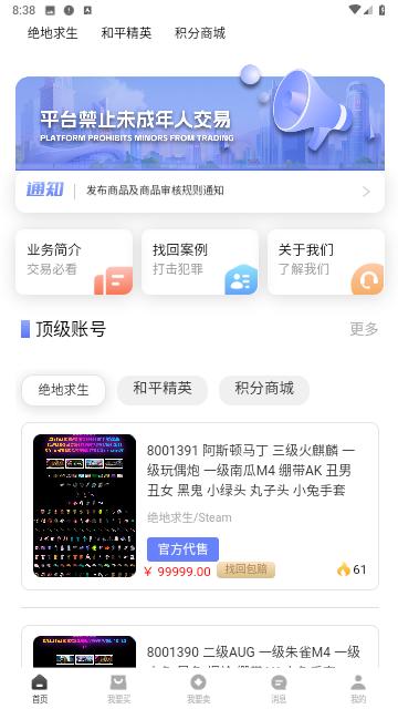 这款软件里面的游戏账号分类十分的详细,用户能够快速找到自己需要的游戏账号,另外软件中还有强大的搜索系统,用户能够在这里搜到任何自己喜欢的游戏账号,软件的页面也十分简单干净,用户只一眼就能够看到自己需要的游戏账号,十分的方便。