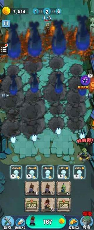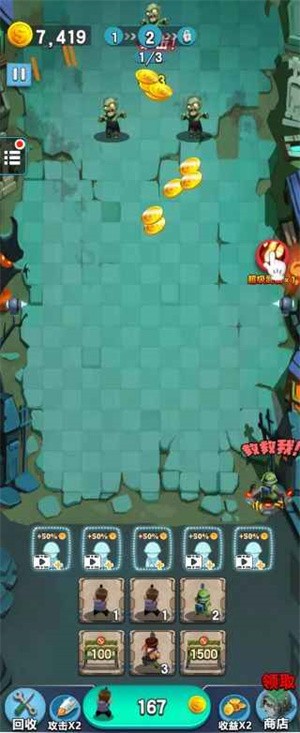 金币打爆僵尸是一款打僵尸玩法的放置塔防游戏,使用金币招募勇者去战斗,消灭前方来袭的击败,相同的勇者黑开业合成升级,强化你的作战实力,将所有的僵尸都在这里消灭,完成塔防的战斗,将僵尸统统击败。将哪些僵尸全部打爆,消灭你的敌人,一定不要让僵尸攻击你的大门,当僵尸入侵的时候,游戏挑战就失败了。完成一场场游戏大战,保卫你的基地,将这里僵尸全部击败。