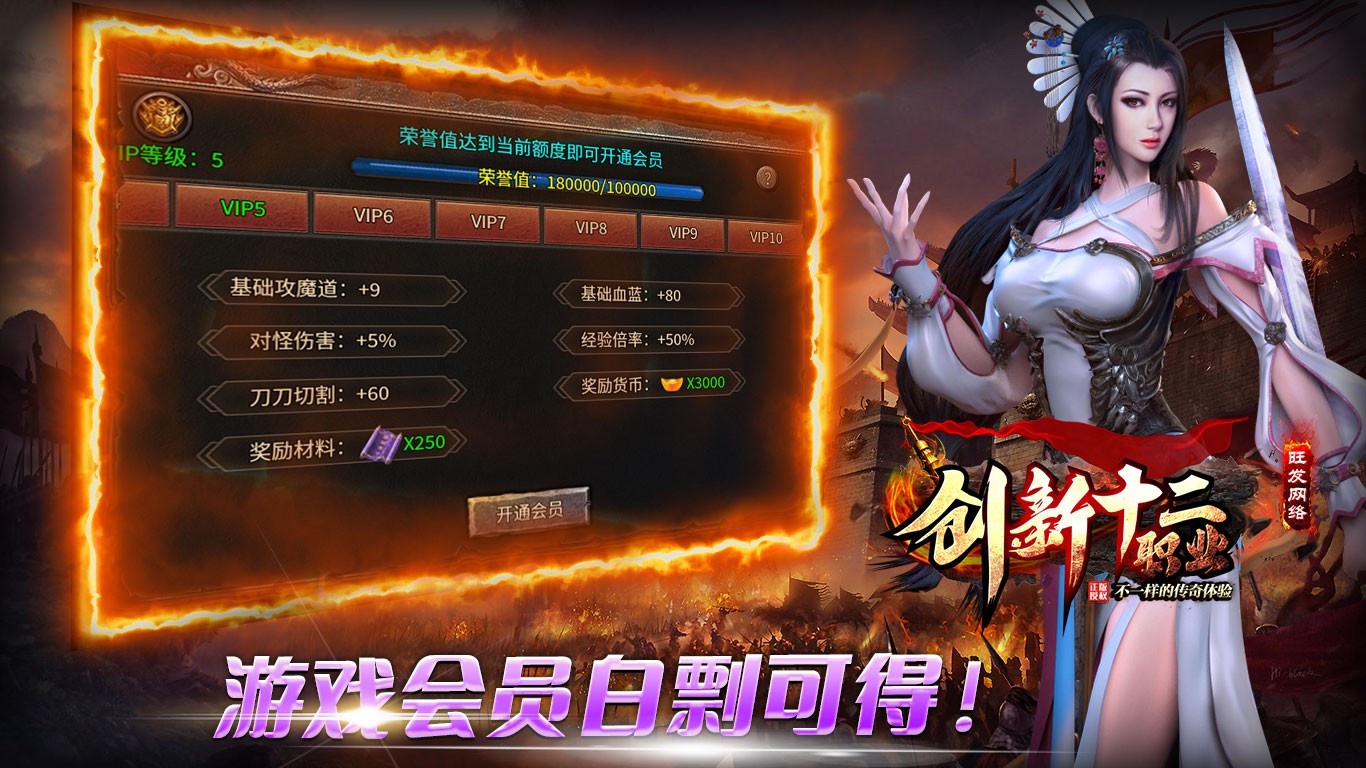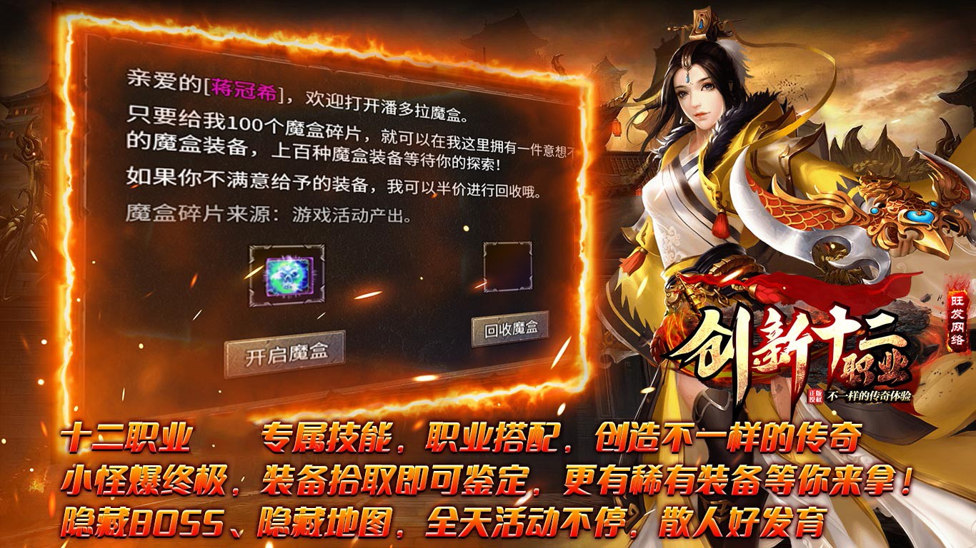 旺发创新十二职业为玩家带来精彩爽快的传奇玩法,海量的职业选择,玩家能够自由地转职战斗,超多创新的玩法,游戏内无任何的暗坑和套路,所有的装备货币全靠打,各种强力的神装轻松获得,感受刀刀暴击,刀刀切割的爽快体验,称霸整个传奇世界。