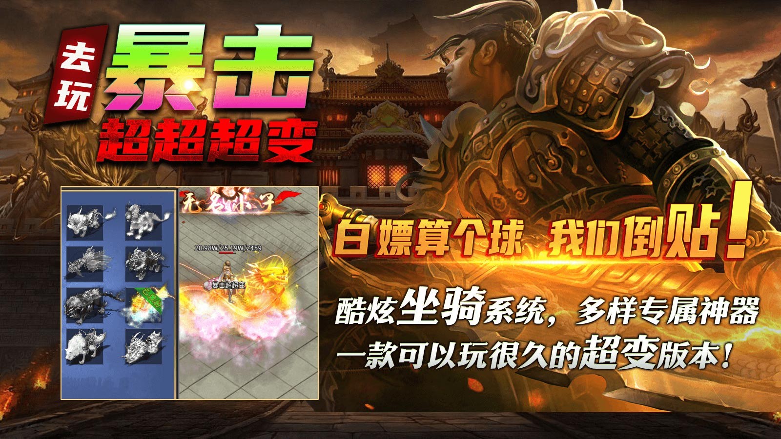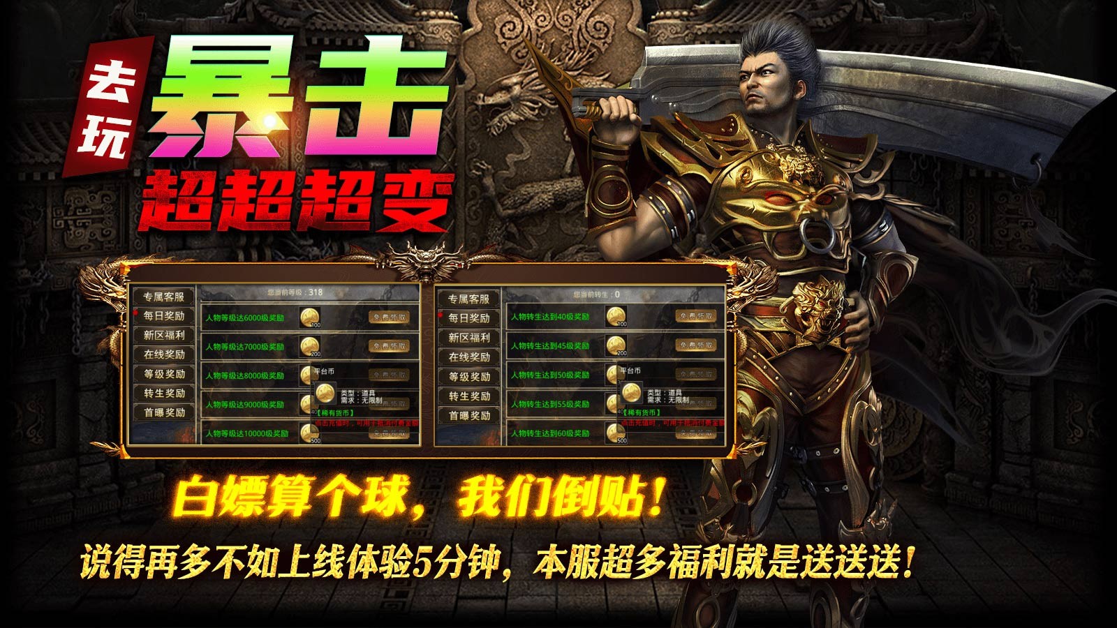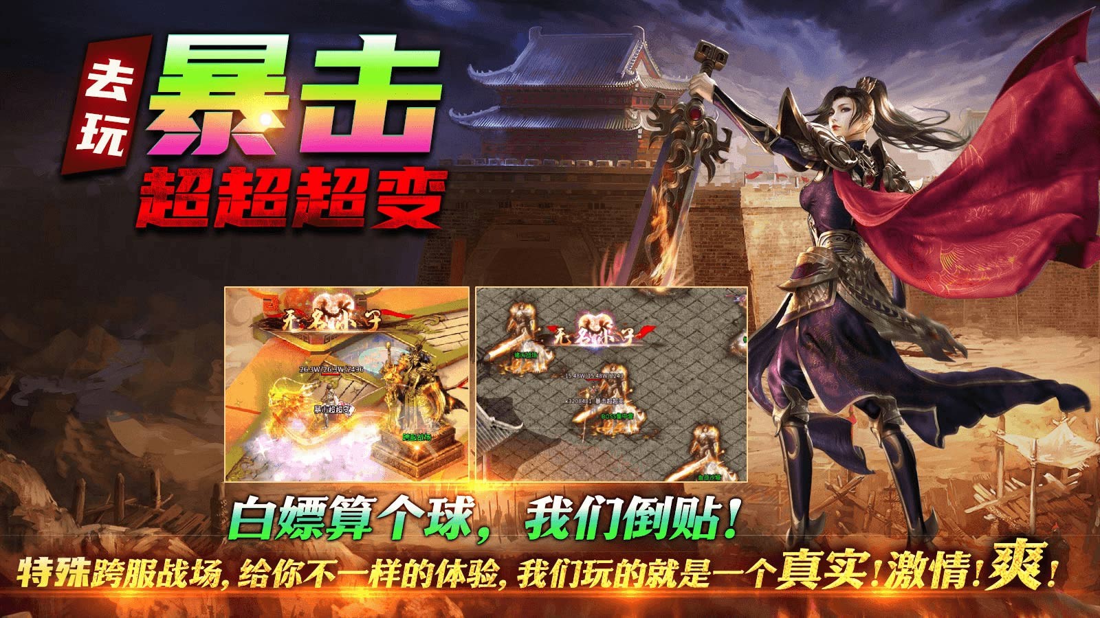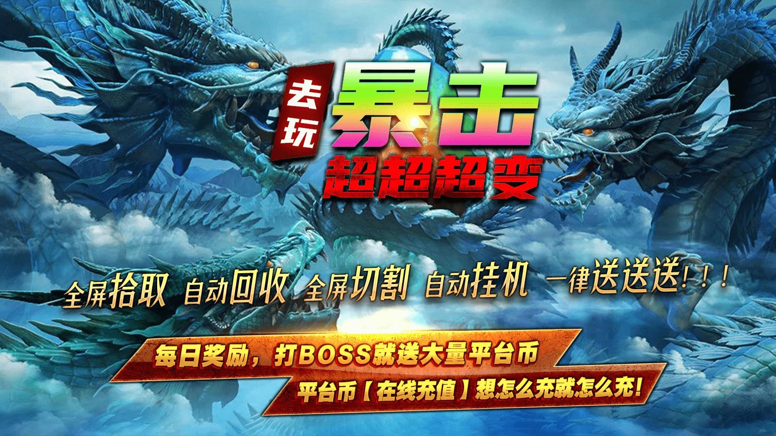 去玩暴击超超超变为玩家带来精彩爽快的超变传奇玩法,整体的掉落率相当的高,随时都能够加入刷怪打金的战斗中,组队挑战强大的世界boss,瓜分稀有的资源和奖励,轻松获得大量的奖励,助你快速到达战斗力的巅峰,称霸整个传奇世界。