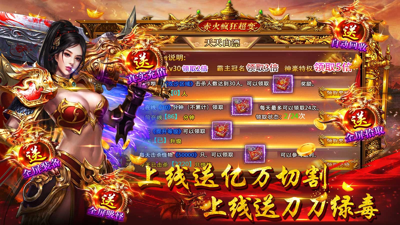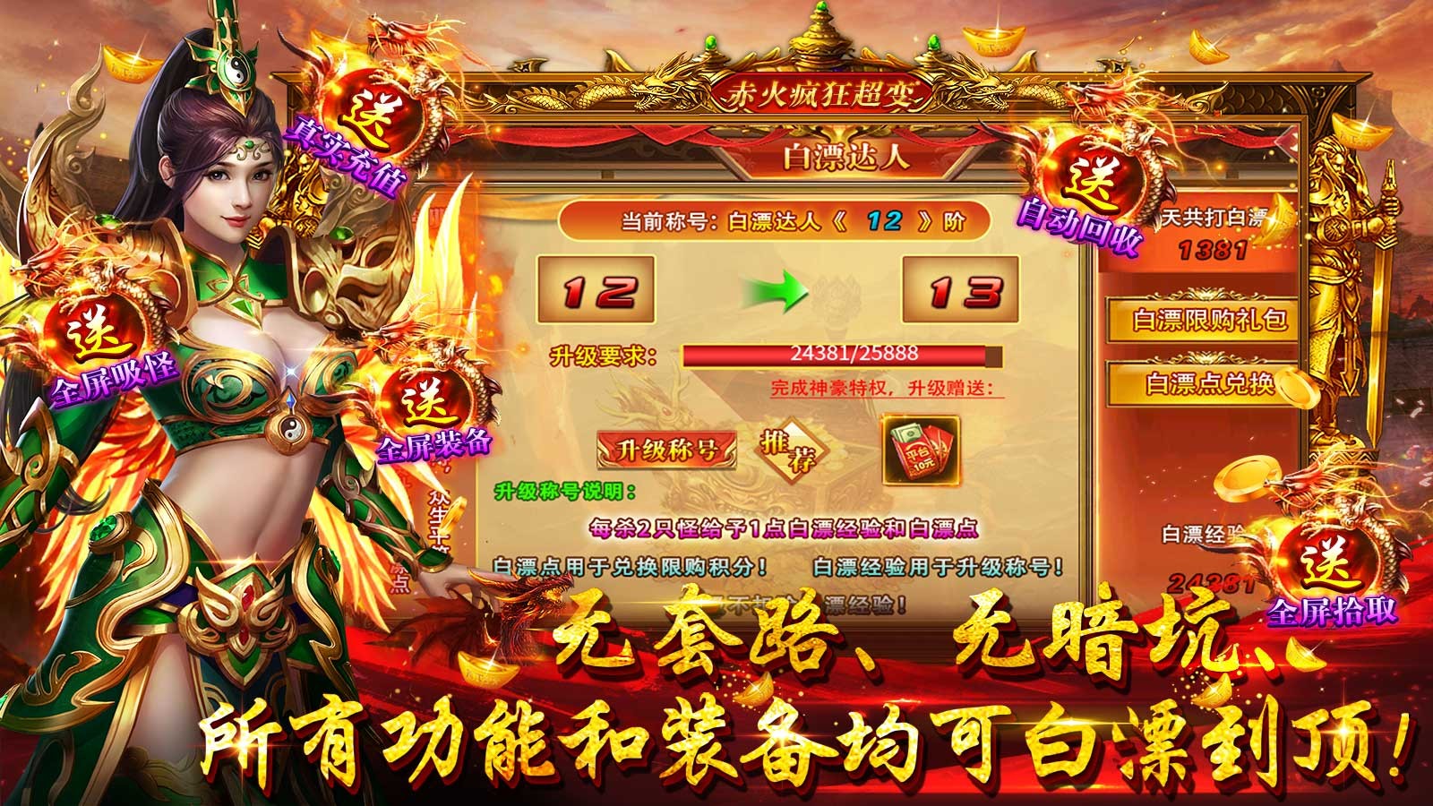 赤火疯狂超变为玩家带来经典热血的超变玩法,开放式的场景地图,所有的大陆和副本等待着你的探索,简单容易上手的操作,诸多创新的玩法等待着你的体验,开局即可获得满攻速,感受刀刀暴击的爽快体验,获得遍地光柱的震撼感受,书写属于你的传奇旅程。