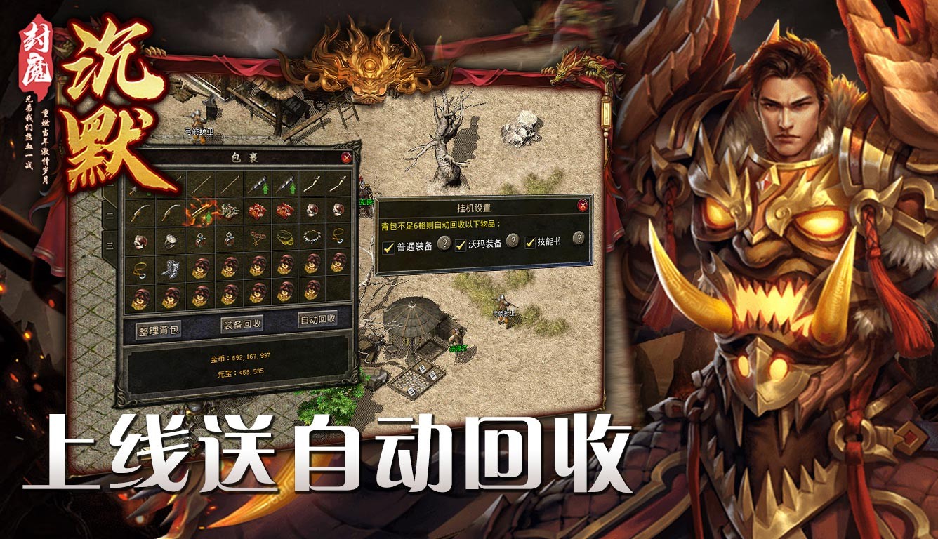 1.全新特色原创版本,我本沉默1.70风格,三职业,上线就送自动装备回收。
