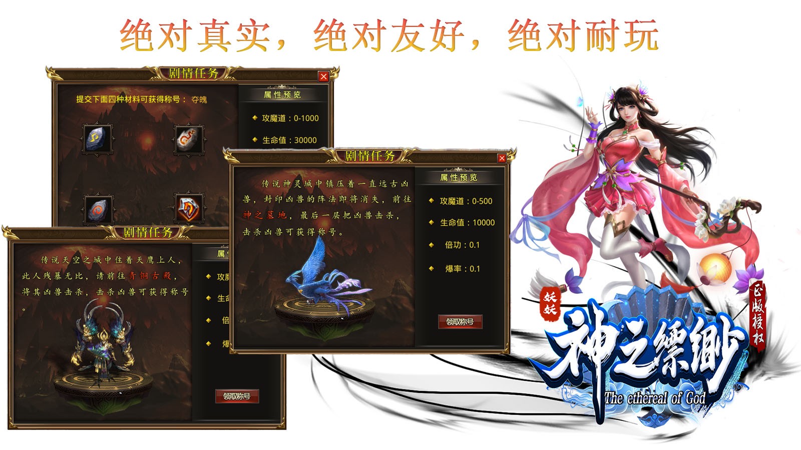 妖妖神之飘渺为玩家带来精彩爽快的传奇玩法,在游戏中玩家将要加入到全新的传奇冒险中,加入到强力的副本挑战中,发挥最佳的战斗实力,尽情地享受刀刀暴击的爽快感受,获取强力的神装武器,助你到达战斗力的巅峰,书写属于你的传奇冒险之旅。