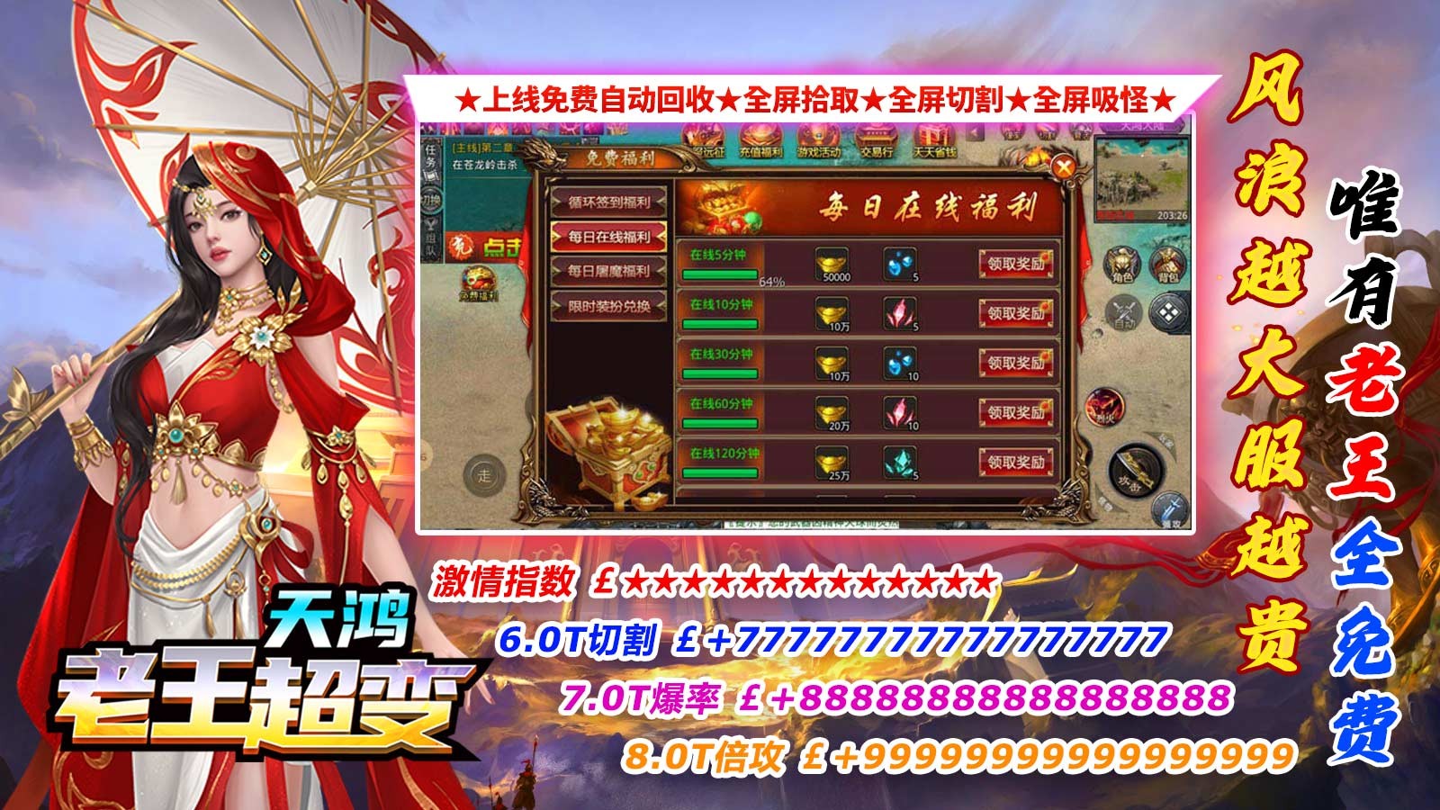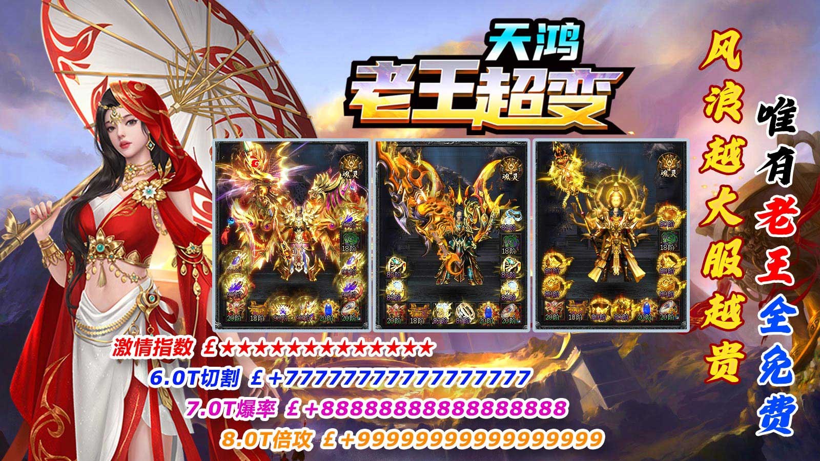 天鸿老王超变为玩家带来经典的超变传奇玩法,经典的三大职业选择,玩家能够自由地进行转职,海量的技能选择,所有强力的大招无冷却自由释放,加入到精彩的传奇大陆中,享受刀刀暴击的爽快体验,尽情发挥最佳实力,畅享热血的传奇冒险。