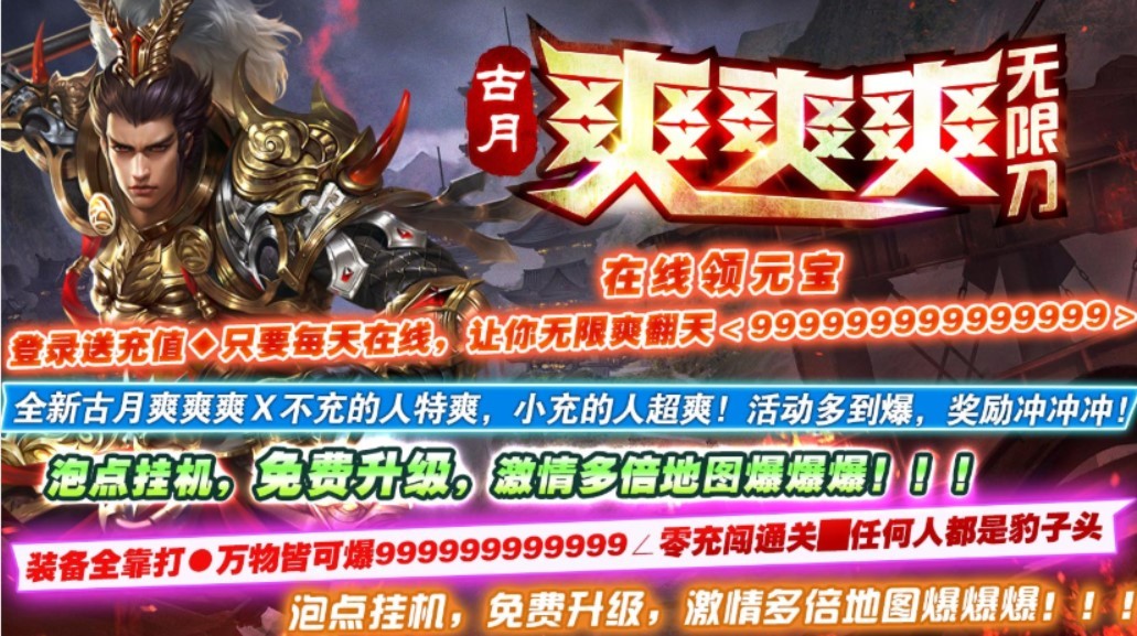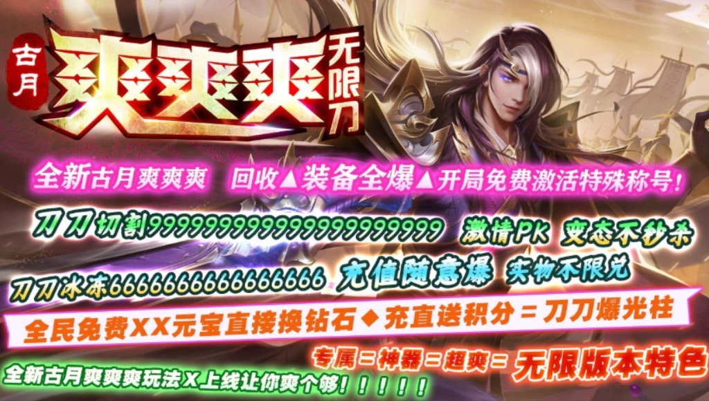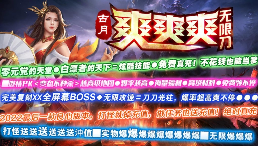 古月爽爽爽无限刀传奇来袭,刺激传奇竞技有,在线轻松获取各色游戏礼包,趣味竞技传奇,传奇礼包奖励:红泥宝奖励*10,经验宝箱*100,真充卷轴*10,时装碎片*10,无限刀竞技特色去,多元传奇奖励轻松获取,特殊竞技传奇版本,杀怪轻松爆资源,一切的传奇资源神器都靠打怪去获取,非常值得去尝试的传奇竞技游戏。