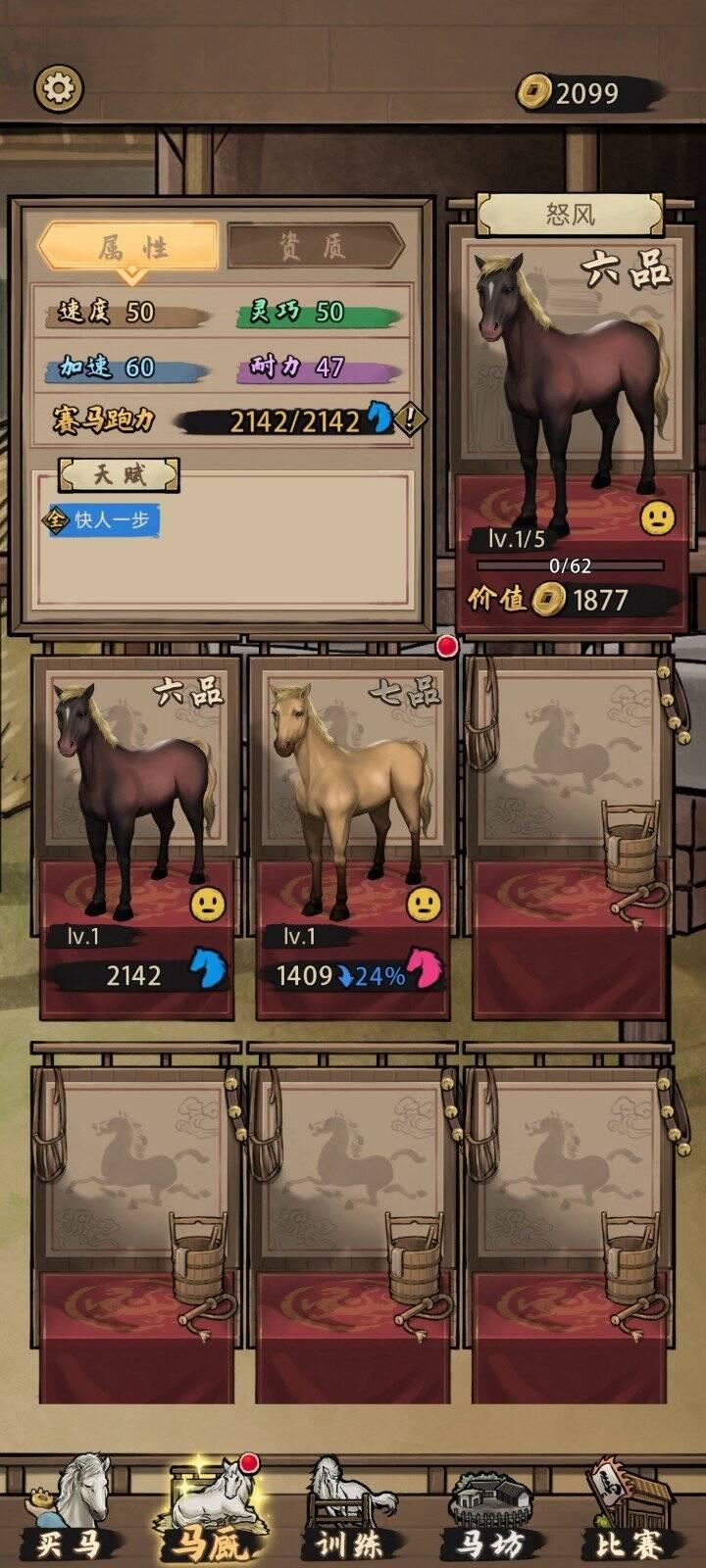 1、拥有多种不同属性的马匹可供选择,让玩家体验不同的马匹特点和优势;