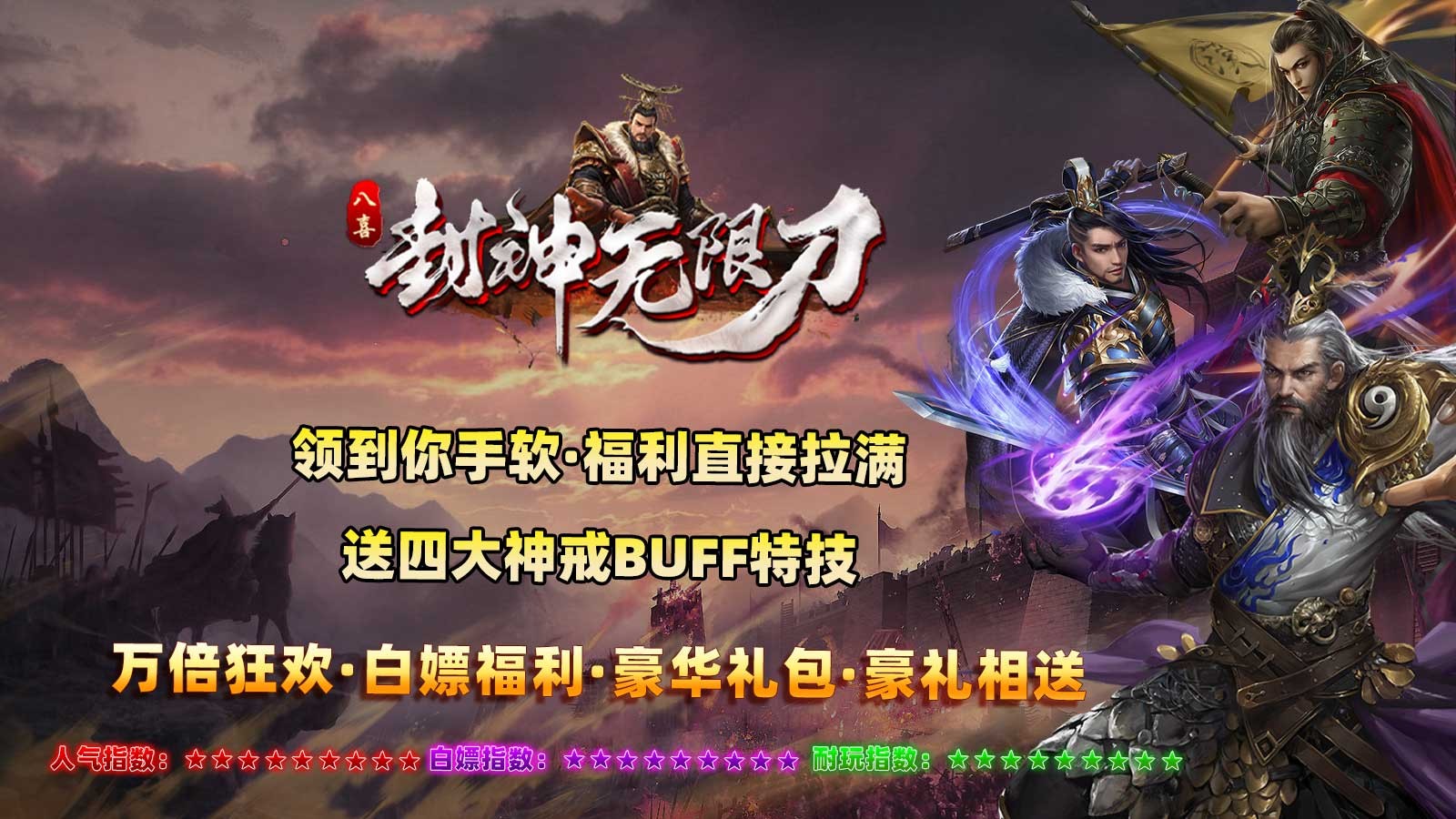 八喜封神无限刀有着趣味十足的传奇玩法,经典的无限刀玩法,开局即可获得满爆率,整体的掉落率相当的高,随时都能够加入到刷怪打金的战斗之中,与各路高手展开同台竞技,尽情地享受刀刀暴击的爽快体验,获得强力的神装奖励,称霸整个传奇世界。