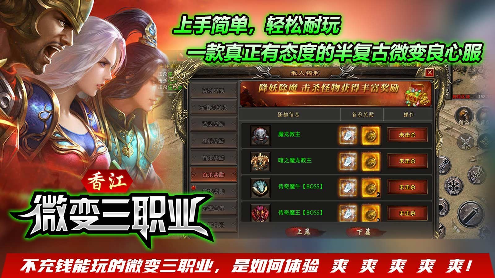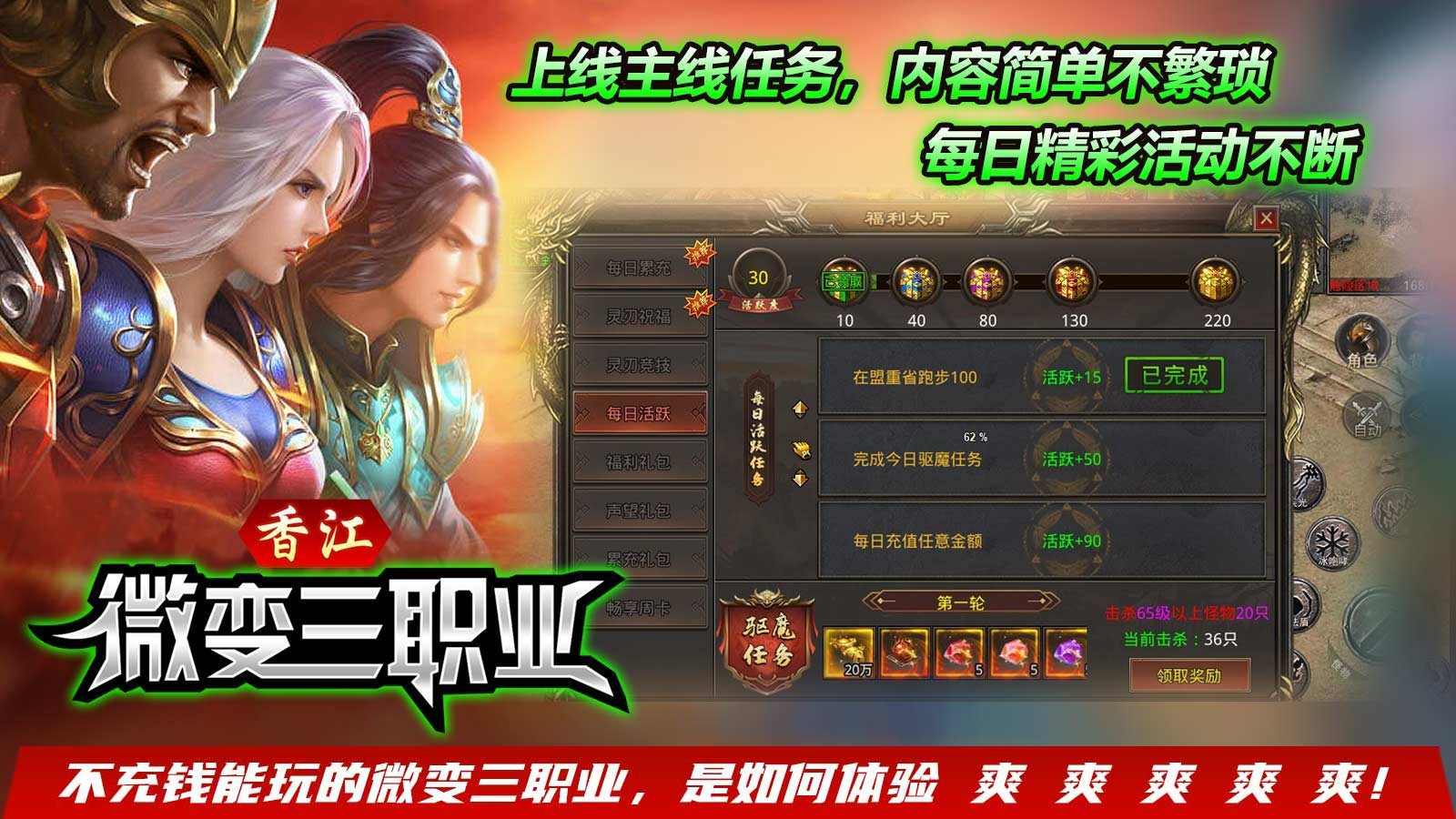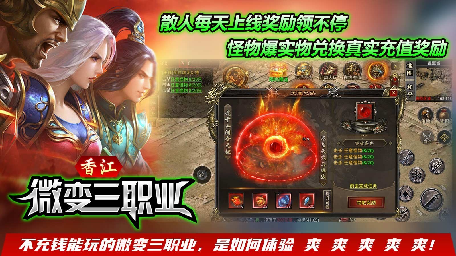 香江微变三职业为玩家带来精彩爽快的传奇玩法,战道法三大职业完美平衡,随时都能够自由转职,各种强力的技能大招自由搭配选择,大招属于自己的战斗方式,加入到千人攻城的战斗之中,战友齐聚,重温当年热血激情,称霸整个传奇世界。