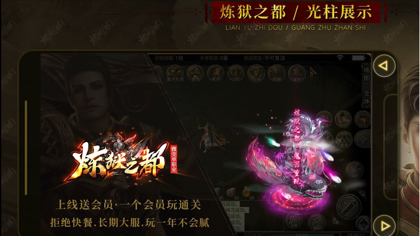 一六微变炼狱之都为玩家带来经典热血的传奇玩法,玩家将要加入到精彩的传奇世界中,所有的场景和地图都能够自由探索,所有掉落的物品自动拾取回收,感受刀刀暴击的爽快体验,野怪也能够掉落中,花费时间即可全部打满,感受热血高爆对决,书写属于你的传奇旅程。