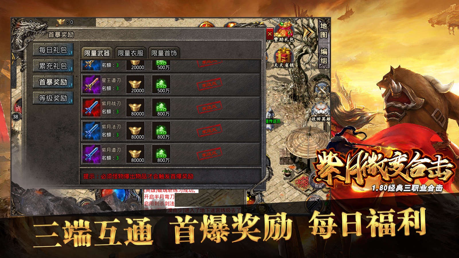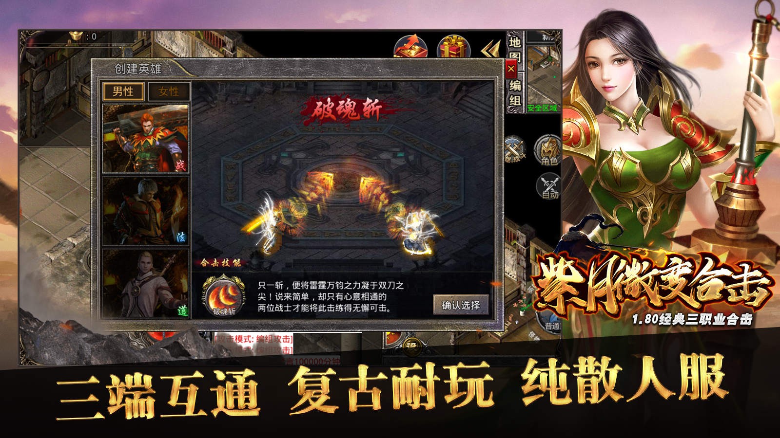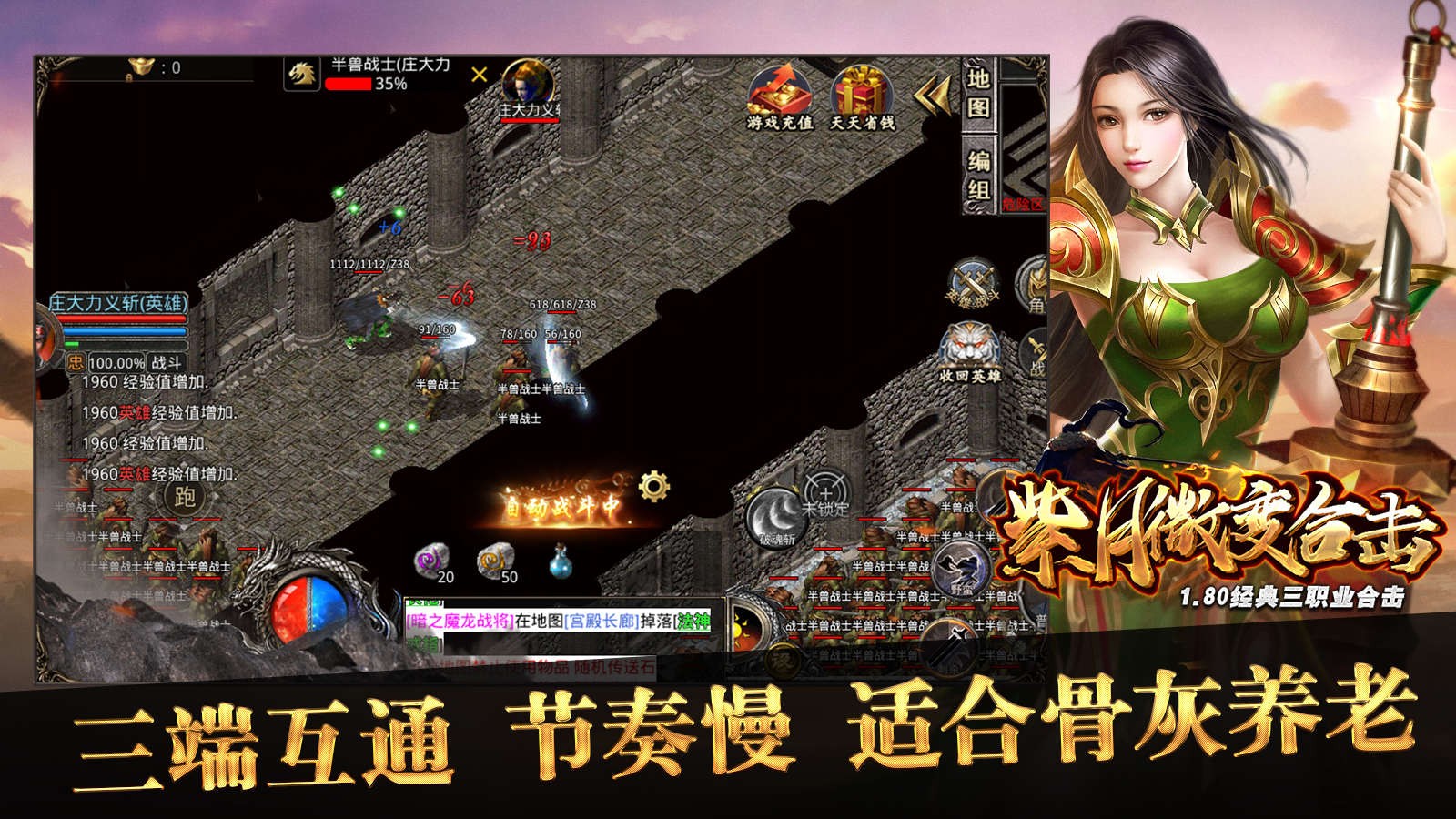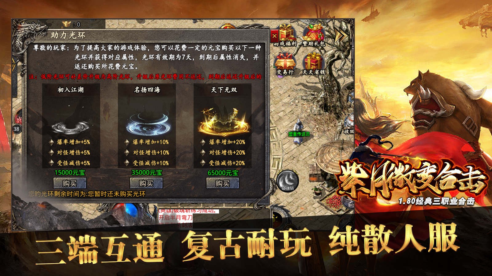 紫月复古合击为玩家带来经典的三职业传奇玩法,在游戏中玩家将要加入到精彩庞大的传奇世界中,所有的大陆和地图都能够自由地展开探索,组队加入到副本的挑战,与各路高手展开同台竞技,挑战强大的世界boss,体验畅快的传奇对决。