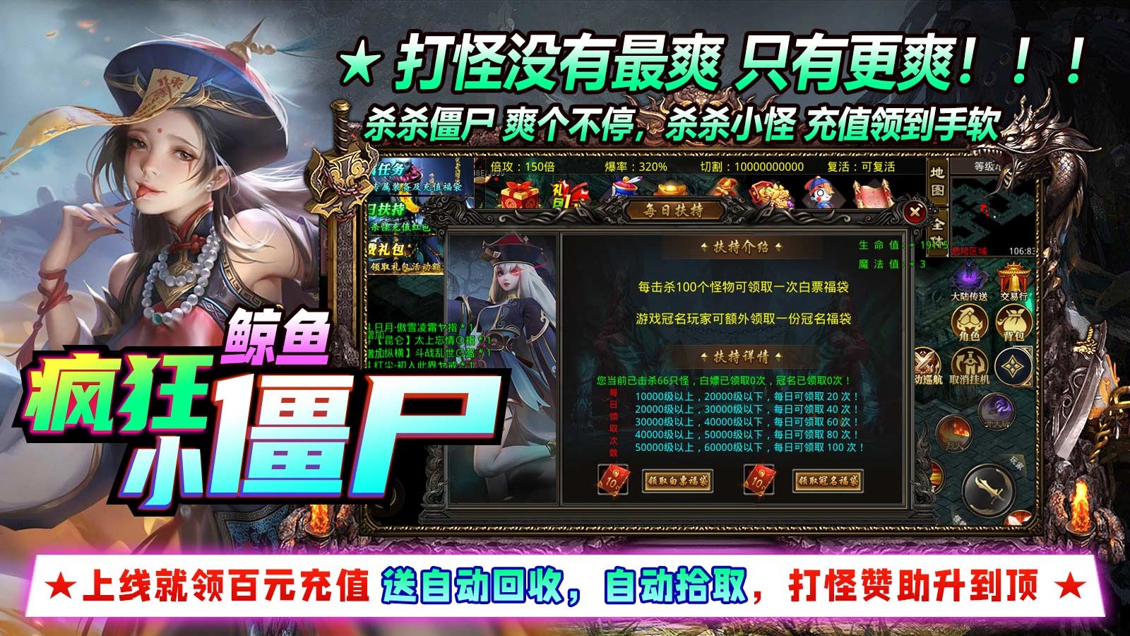 鲸鱼疯狂小僵尸为玩家带来精彩爽快的超变玩法,在游戏中有着精彩复古的场景画面,所有的区域都能够自由地展开探索,诸多强大的敌人将要来袭,尽情地享受刀刀暴击的爽快体验,超多创新的玩法等你来体验,一刀秒怪畅玩传奇世界。