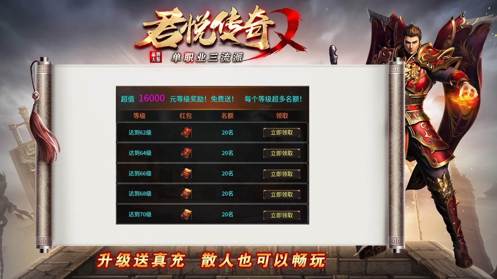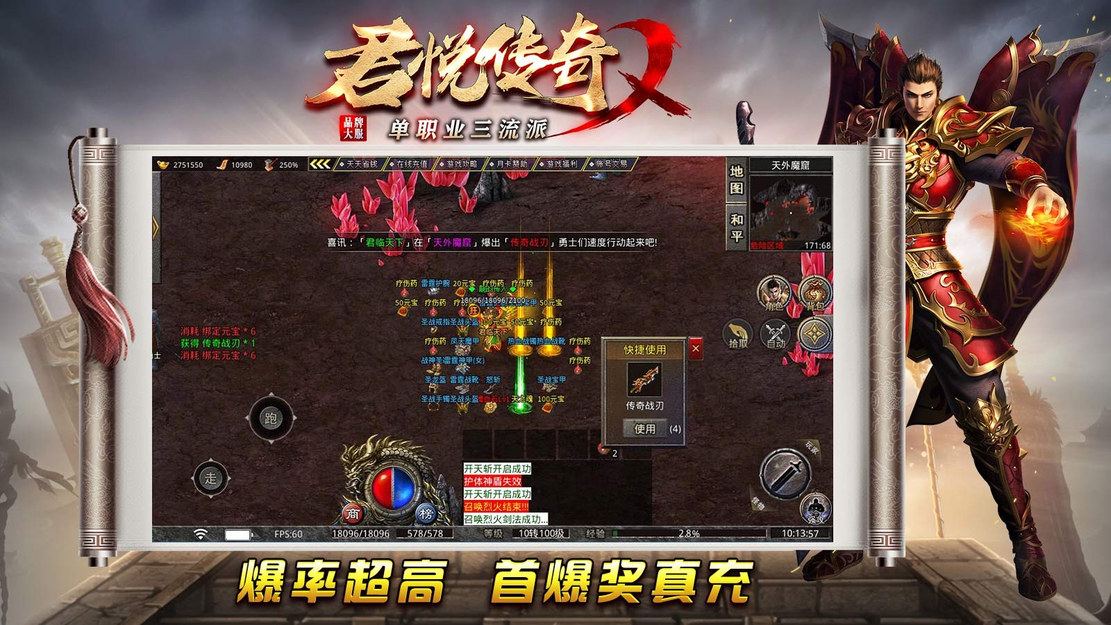 君悦传奇有着热血爽快的传奇玩法,单职业玩法,诸多丰富的技能供玩家选择,打造属于自己的战斗流派,加入到野外的战斗之中,所有的野怪boss即时刷新,掉落的物品永久保值,自动回收拾取,助你飙升战斗实力,畅享爽快的传奇对决。