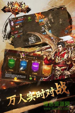 战神传奇是一款以战争为主题的即时战斗手机游戏,游戏以经典端游《热血传奇》为蓝本,传承传奇经典元素,还原一呼百应群起而攻之的万人沙巴克城战.游戏采用丰富活动玩法和角色成长养成相结合的模式,画面力求营造出逼真写实的场景视觉效果,重现曾经承载万千传奇梦的玛法大陆.沙巴克烽火重燃,十年兄弟,我们再战沙城!