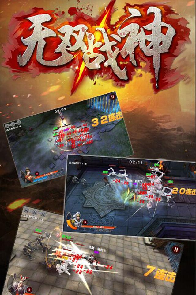 《无双战神》是一款抛弃了传统的虚拟摇杆,采用革新手势操作的3d动作手游。以强烈的打击感、爽快的无双式割草体验为特点,为玩家带来独战千军、斩将夺魁的激烈战斗感受。另外,还依据三国史实引入百名各色三国名将,让玩家得以组成心目中的最强战阵,以无双猛将破敌于指尖之上。简单操作,抛弃摇杆随心而动;强化打击,精细再现无双酣战;名将云集,百名猛将再临三国。
