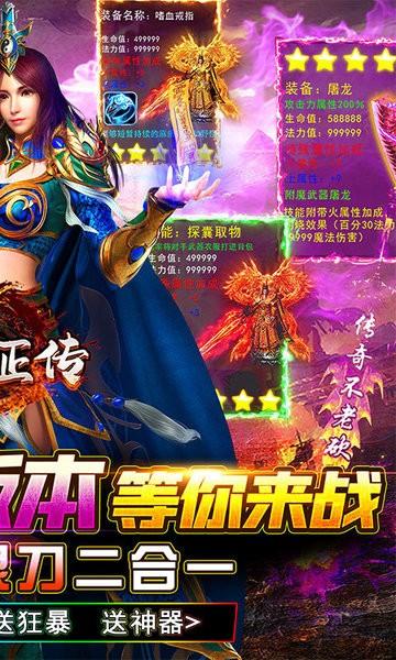 传奇正传游戏添加新元素感受一刀无限连斩,给你更炫酷的传奇手游打发,超高游戏爆率,让你感受各类神装,还有终极技能以及神装五件套等你来拿!一刀杀怪,成就你的传奇!