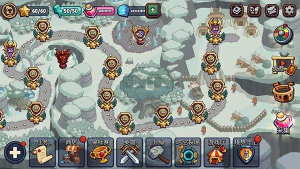 一关完成以后,你会回到主页面,玩到第五关会得到一个新的英雄。你还可以在主页面找到第三张图,点击升级来升级塔,升级塔需要星星,是你打下的每一关里最后得到的星星,一关最多三颗星。