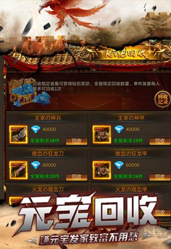 1、1怪=100元宝,神装8倍回收,新服10倍爆率;