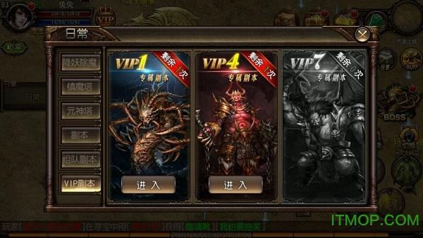 VIP副本里大量珍宝吸引着无数勇士前去寻找。充值达到10元即可成为VIP,拥有进入VIP副本的权利,通过日常任务可进入该副本。