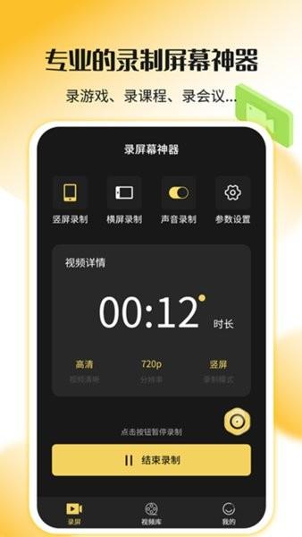 录屏幕神器支持竖屏、横屏录制,悬浮窗一键录屏,还可以调整视频的录制清晰度,支持手机画面实时同步录制,录制视频流畅清晰不卡顿,录制过程中可随时暂停/继续录制,非常简单实用哦!