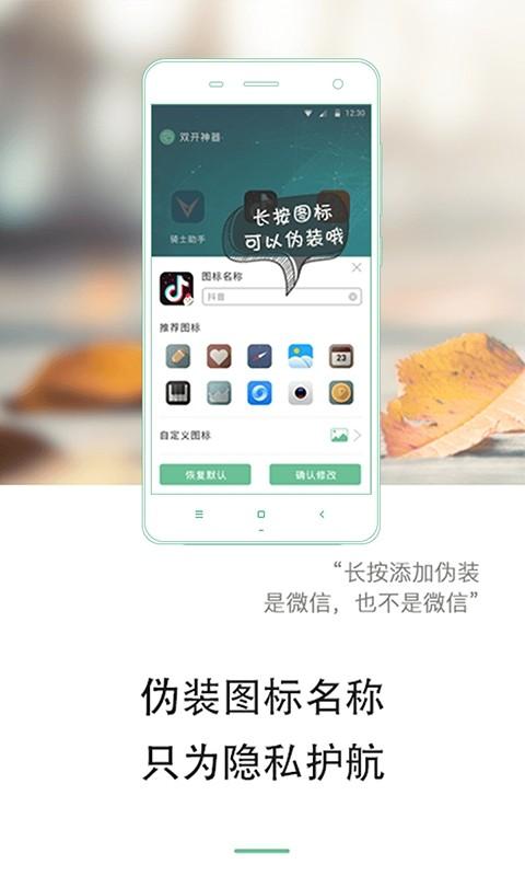 2、分身72变,好看又好记。多开的应用分身,不再是一个图标带不同的数字来区别,你可以自定义分身的图标和名称,分身再也不那么单调了。也可以用来伪装分身,你懂得哦