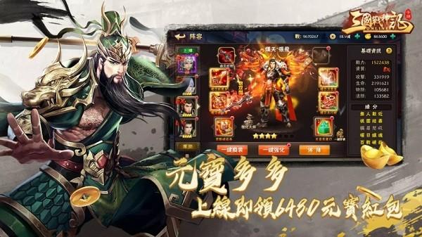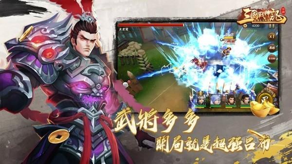 《三国战神记》是一款以三国题材制作,侧重战斗和英雄养成,包含多种技能、装备、宠物等元素的3D动作卡牌游戏。是对三国游戏的全新演绎!有深度!有策略!可单机可联网的沉浸式即时战斗游戏。乱世三国的王城争霸随时火爆来袭,各大势力之间热血厮杀乱斗PK酷炫华丽合击技能让你自由搭配,独创色彩的武将培养系统,极致的走位操控让你随时掌控全局,让你身临其境的体验三国世界的独特风采。