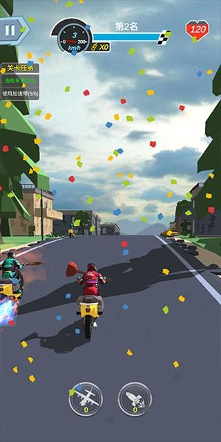1、热血竞速,搏击混战:在高速行驶中,不仅要超越对手,还要智斗他们,用拳头和武器说话。