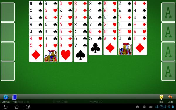 空当接龙仅使用一副牌玩,共 52 张,牌的正面朝上,排成八列。通过从这八列中移牌来创建四叠牌: