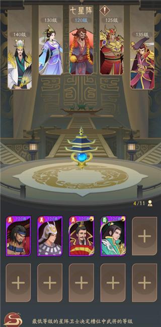 在解锁七星阵后,系统会自动把我们当前身上等级最高的5个武将选做为星阵卫士。剩下未选中的武将都可以放置到七星阵中,放置后的武将其等级将自动同步到5个星阵卫士中的最低等级。