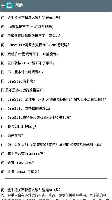 答:到论坛发帖反馈bug。(译者注二国内的还是尽量来nds模拟器吧吧)。请您公开发帖,不要私信或者私下给我们发邮件,这样一来,别人才能帮到您或者您的问题才能帮到有同样问题的人一如果你的问题有解决方法的话。汇报bug时请附上存档,问题描述,还有您的设备信号以及安卓版本,那样会很有帮助。如果您用了金手指,请参照上文方法关掉。