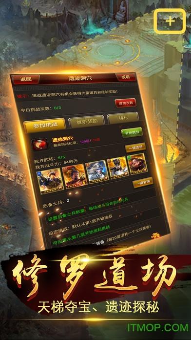 高端玩家熟悉所有玩法之后,还可以进攻道场。这是一块神秘的境地,只有强者才能在这里获得意想不到的财富和经验.区别于普通玩法,天梯对武将战力,布阵方法,策略方针要求更加严格,喜欢有挑战性的玩家,超值奖励在等你。