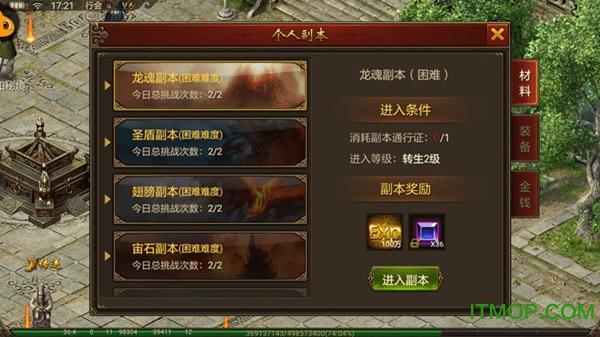 材料类型有龙魂、圣盾、翅膀、宙石、经验五种副本,可产出龙魂碎片、圣盾材料、羽毛、宙石结晶和经验。龙魂副本、圣盾副本、翅膀副本、宙石副本各有三种难度,每天各有两次进入机会。经验副本有五种难度,每天只有一次进入机会。角色转生等级越高,所能进入的副本等级越高。每进入一次副本,都需要消耗一张副本通行证。