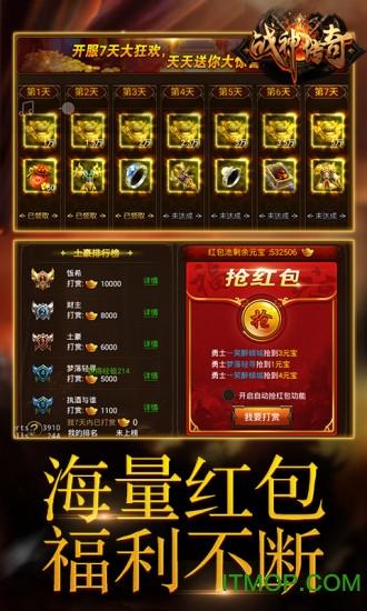 传承经典,铸造永恒!热血战神,续写传奇!2016年暗黑风MMO手游《战神传奇》火爆上线。三大经典职业,数十张经典地图,上百种经典怪物和BOSS,上千种经典道具,万人攻城之战再现热血青春岁月。这里的行会有我们曾经的兄弟,这里的BOSS掉落满地的装备,这里的攻城会响起曾经的战歌,号令天下,一战封神,尽在《战神传奇》。