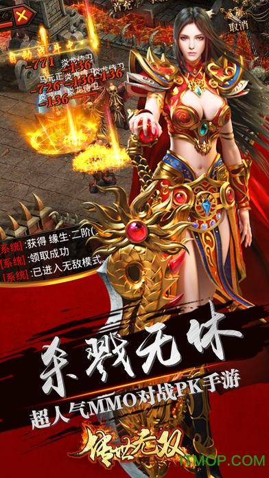 《传世无双》在继承了经典“传世系”玩法的基础上,独创了全新的“无双模式”,将街机中的经典元素“连斩”引入游戏PK,玩家在打怪和PK中可以积累连斩数,当到达一定程度,就会进入“无双模式”,释放超级华丽的全屏秒杀技,引爆热血激情的超爽PK。