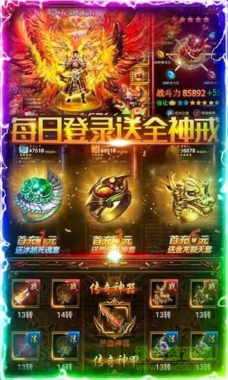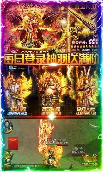 全新大型放置类传奇游戏,首充立即开启免费充值功能!免费充值激活任意奖励!!!游戏还拥有精致的画面和炫丽的技能效果,三职融合,战士带狗,极致攻伤,一刀致命!PK打宝战沙城,热血豪杰闯天下!游戏内Boss超多,打完后还可以挖掘Boss出钻石,装备爆率高可回收百万钻石。龙皇秘宝还可以出热血神装,神装技能焚天灭地斩全屏爆龙。除此之外还有土豪装备,左手神兵灭霸手套等超多装备法宝。兄弟在聚热血争沙,赶紧和兄弟们一起进服吧!