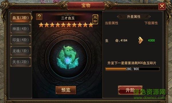 最传奇的宝物分为五中,分别是“血玉”“神盾”“印玺”“龙魂”“天书”。每种宝物都有十个星级,当培养到十星后,宝物就会成长到下一个阶段。每种宝物都有十个进阶阶段,有朝一日达到满阶,那便如同于最强的存在。