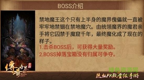 "在邪恶与黑暗面前,我不愿意做软弱的人类,为了保护宗族与家人,即使只能有一半的身躯,变成魔鬼又如何!"由魔君亲手囚禁千年,在禁地魔穴成为只有上半身的傀儡守卫,禁地魔王是诸多BOSS中颇具神秘色彩的悲情角色.