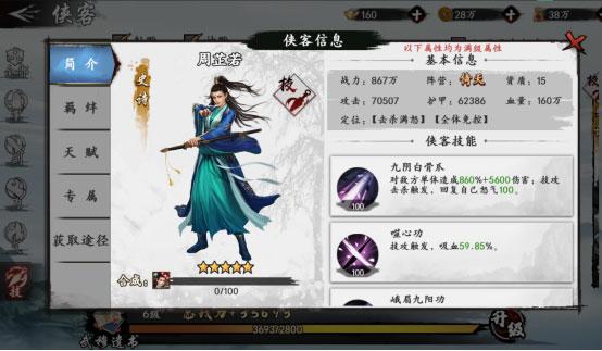 南帝:60%的几率让全体友方侠客治疗200%的攻击血量,如果超出上限则转换为护盾。