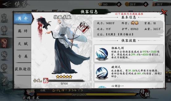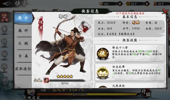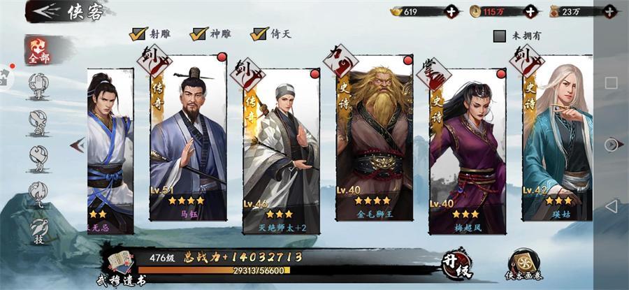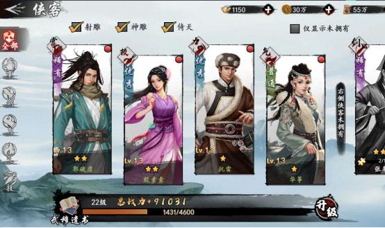 首先我们可以在游戏中点击侠客进入功能界面,查看已拥有和未拥有的侠客信息,界面左侧提供5种职业属性侠客的筛选按钮,左上方则能够快速筛选“射雕”、“神雕”、“倚天”三个不同阵营的侠客信息。