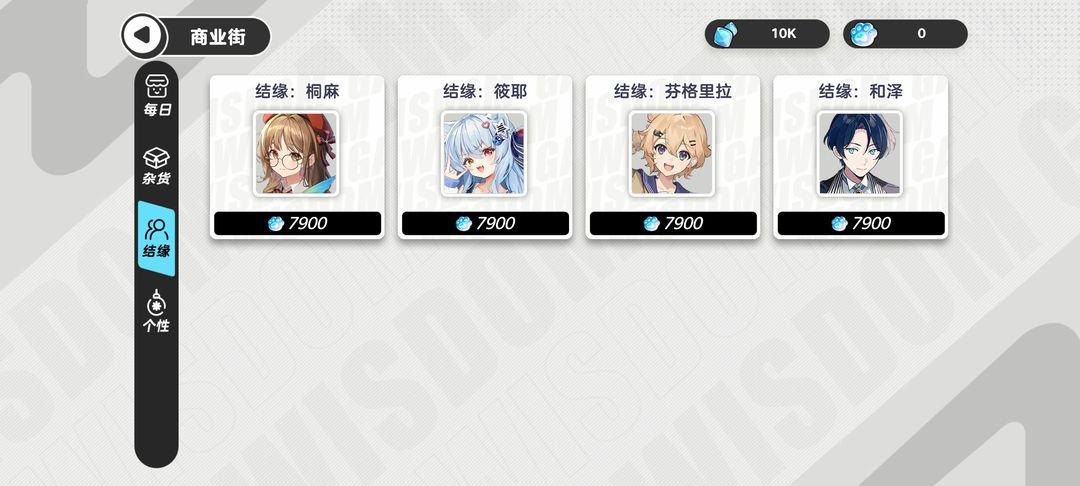 2.目前只有两个角色可选,剩下四个人物要自行解锁。绘风可爱,无氪金点,但要肝,肝完买时装买表情包等。