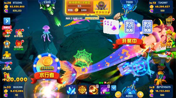 美人鱼BOSS不定时随机出现,自身带有一层护盾。很多玩家看见美人鱼出现了就激动不已,立刻用炮台锁定目标射击,最后弹尽粮绝破了护盾,美人鱼却被房间里的其他玩家捕到了,有种为他人作嫁衣的感觉。所以看到美人鱼出现的时候,不用急着瞄准射击,而是要先调低自己炮弹的倍数,再引导其他玩家一起攻击。这样玩家的子弹消耗的不是很快,护盾也能够快速击破。
