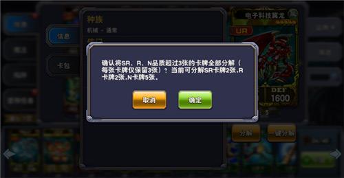 通过【一键分解】功能,可以将玩家当前拥有卡组中,SR、R、N品质超过3张的卡牌一次分解完毕(每种卡牌仅保留3张)