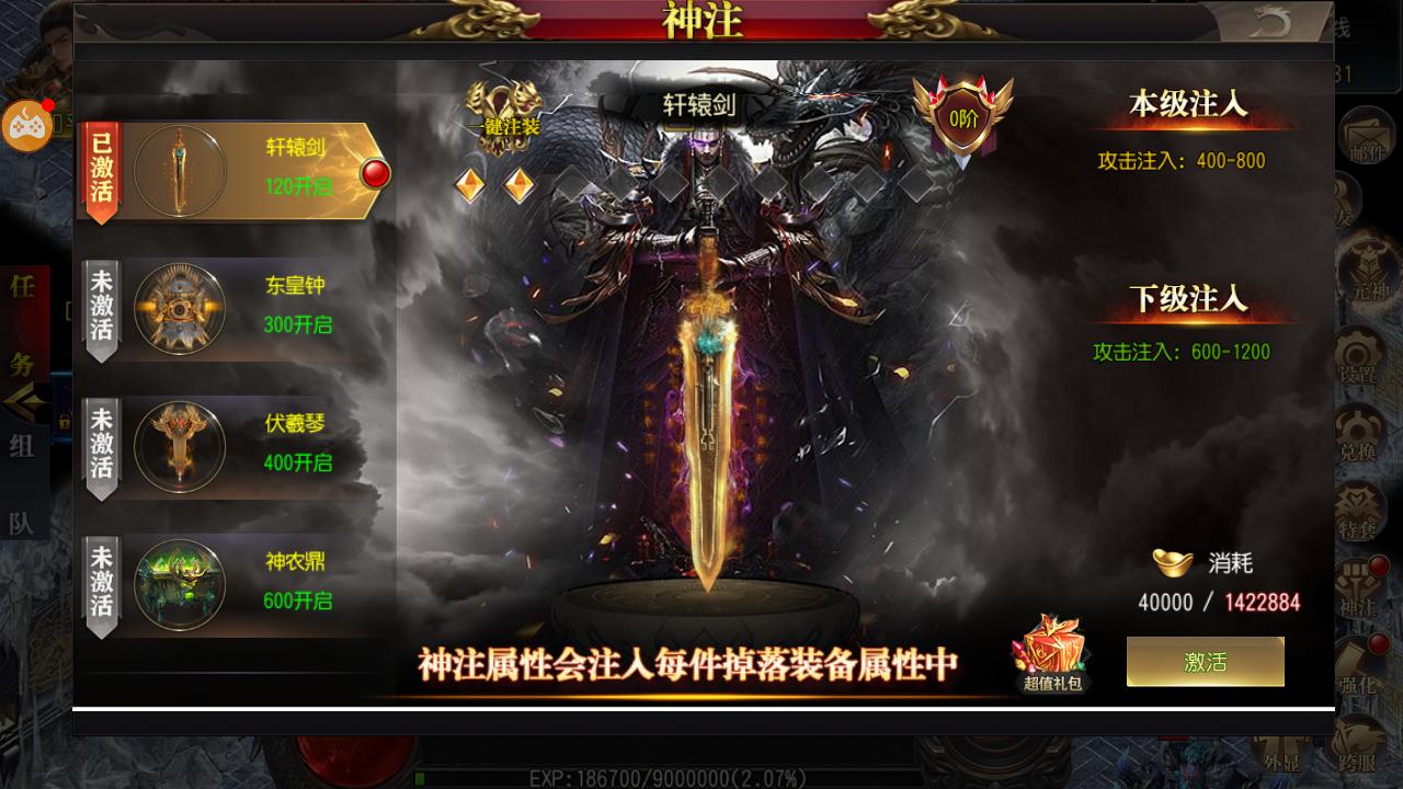 2、激活升级后的属性会在拾取掉落的装备后直接注入到每件装备中来提升装备属性