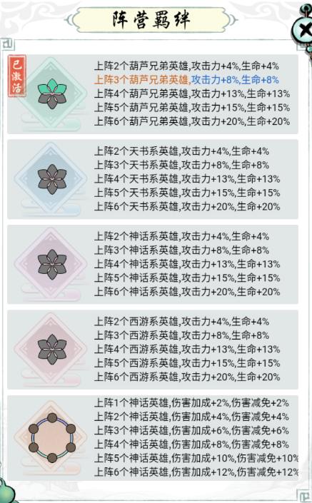 4、阵营羁绊:通过上阵同类阵营英雄数量来增加集体属性。