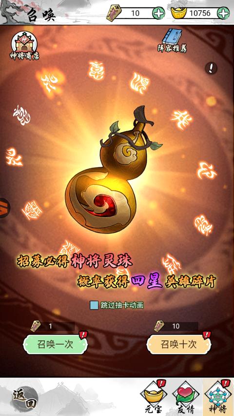 召唤分为元宝召唤、友情召唤和神将召唤,其中的英雄碎片则是通过各种活动、副本和召唤获取。