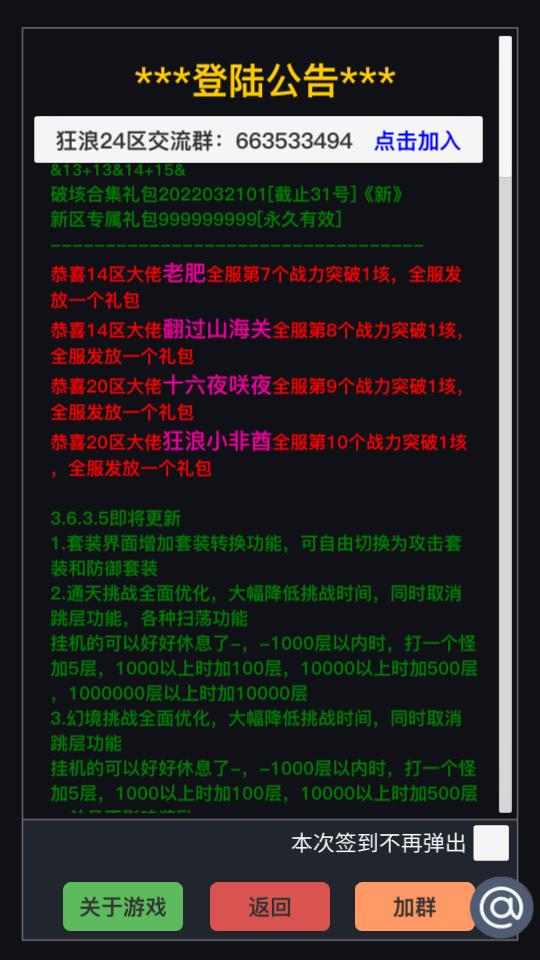 4.幻境上限从3万层开放至10万层,难度恢复,但是暴击不变,保持现在的状态(可查看3572版本更新,幻境彻底取消暴击,怪物伤害降低95%,攻防血也都大幅降低)