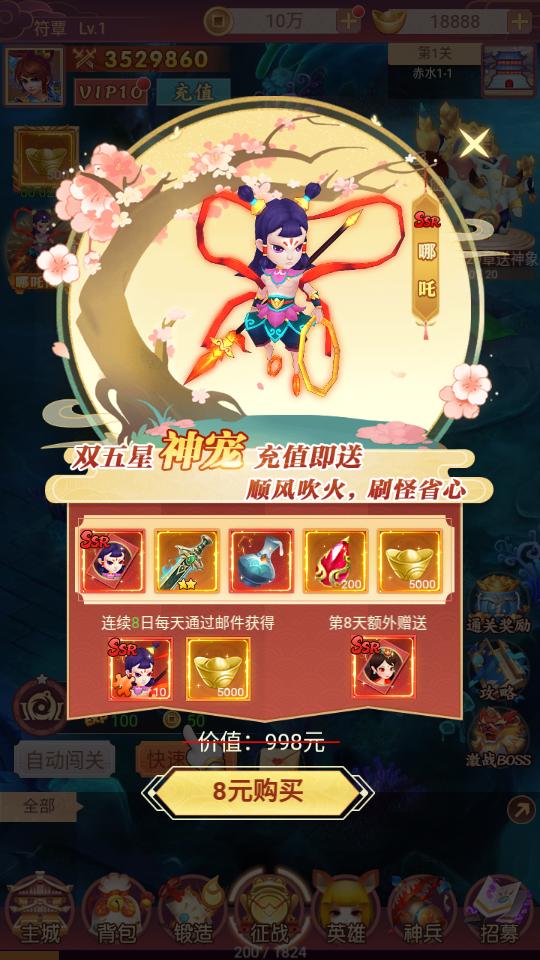 通关送神级装备和五星英魂,R神级英雄,十日登录送斗神神装和极品SR神将,更有海量奖励等你来拿,多变的宠物仙友搭配,五种流派阵容推荐,能抗能打,特色结婚系统,结婚送豪宅,一起经营你们的家