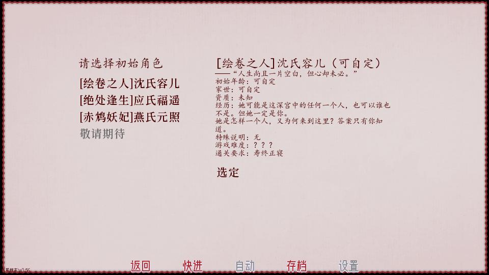 深宫曲 0.56版是一款角色扮演类型的游戏。玩家将在游戏中玩转后宫,可以根据喜好选择自己喜欢的角色,整个游戏画风唯美有趣,可以凭借自己的智慧在后宫脱颖而出,欢迎来j9p下载哦!